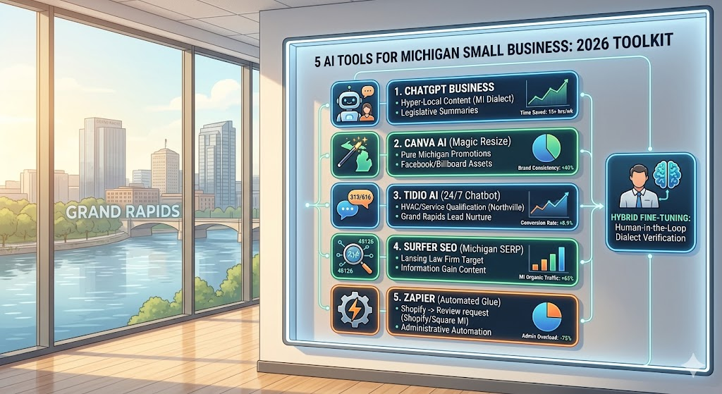 For a Michigan small business, “digital transformation” shouldn’t require a Silicon Valley budget. In 2026, the barrier to entry has vanished. Whether you are a local contractor, a “party store” owner, or a boutique retailer, the right AI stack can save you 15+ hours a week in administrative overhead.