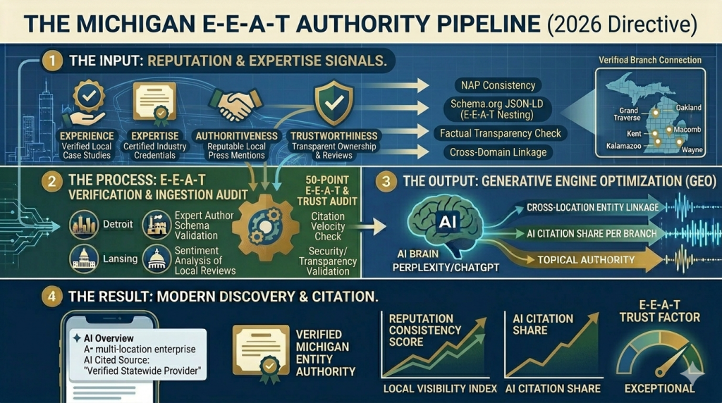 This infographic (Image 30) visualizes the four critical phases of the 2026 E-E-A-T governance directive for Michigan brands. It shows how reputation and operational data are processed into a major ranking and citation advantage: