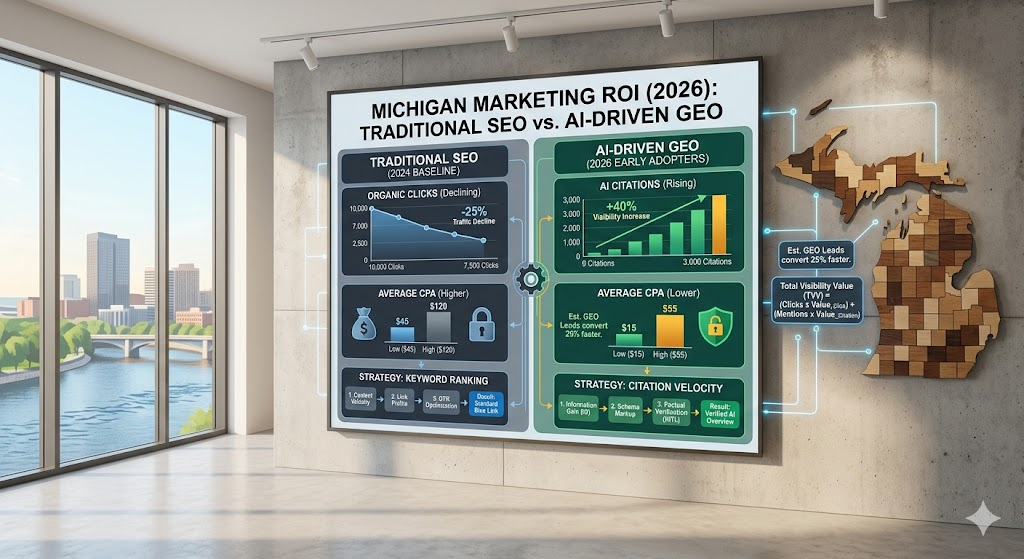 In 2026, the Michigan marketing landscape has bifurcated. While traditional SEO still drives valuable discovery for commercial-intent queries, Generative Engine Optimization (GEO) has become the primary driver of brand influence and “top-of-funnel” visibility. For a Michigan business, understanding the shift in Cost Per Acquisition (CPA) and Attribution is the difference between a growing pipeline and a stagnant one.